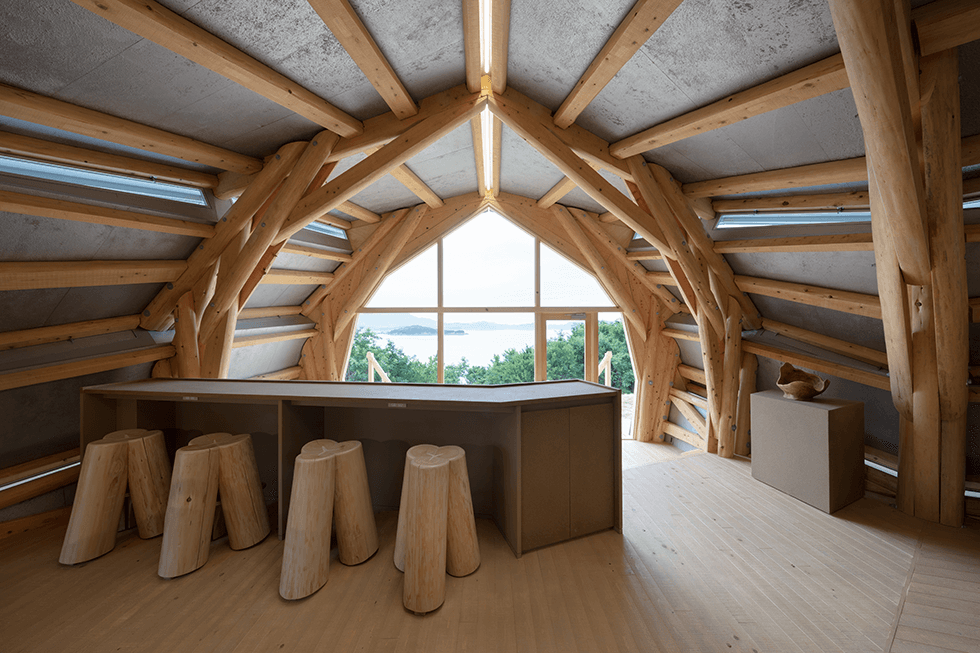 建築は長寿の見事なオリーブの木を抱くように三又プランが採用されているようだが、建築外観全貌を一眼で確認することはできない。しかし迎えてくれる建築の姿は、かわいいとも無骨ともアンバランスとも、実に形容しがたい様相をして、緩やかな起伏と傾斜のある敷地に、なぞるように這いつくばるようなそれは、鎧を纏った甲殻新生物のような姿をしている。オリーブ樹木を加工したハンドルを引き中に入ると、内部はアーチ状の空間のつながりが 瀬戸内の海やオリーブ園など三方向の開口の先の風景に向けて放たれ伸びやかにつながっている。 丸太の組み合わせで構成された空間は、力強さを醸し出しながら、いたるところの関節が動き出しそうな緩やかな結合をして成立している。小豆島内で伐採した檜を、皮剥や乾燥、製材、ジョイント加工、工場組上、現場搬入組立、更に基礎を島内で取れる花崗岩を用いるなど、全ての建設工程を、素人である社員総出で行ったというから驚きだ。そして丸太端材も家具に使うなど伐採材を余すところなく使い倒したという。チタン亜鉛鋼板で覆われた分厚い屋根であり外壁は、自然採光や通風のために分節され、生まれたスリットには防虫などの細工もなされて、手仕事の緩い仕上がりが、建築を呼吸する生き物のように思わせる芸術的な要素になっている。