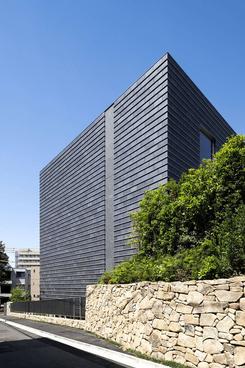 「やきもの」で覆い、茶道美術館を象徴する外観とした新館。瓦風の陶板による乾式なまこ壁を考案
