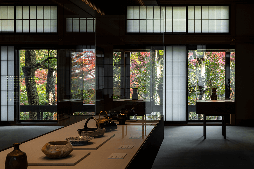 美術品を自然の移ろいとともに鑑賞できる、希少な展示空間。茶道具がより引き立つ後景を整えた