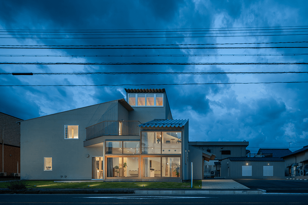 前面道路からみる。背後のレンズ工場、駐車場、道路と各方面へ顔を持ち、それらをつなぐ佇まい
