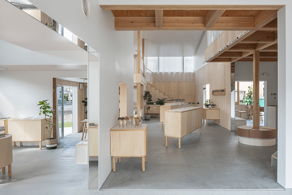 また建築の平面計画は動きのある風車型の構成で断面とともに立体的な「見る見られる空間」となり、明るい光に満ちた"中心"に位置するショールーム、店舗だけでなくその"周縁"となる、アルコーブのような小さな落ち着けるコーナーの場所にワークショップスペースやカフェを設けていて、人との出会いとともに過ごす場所という地域社会とつながる拠点の一つともなることが、建築空間として実現されている。