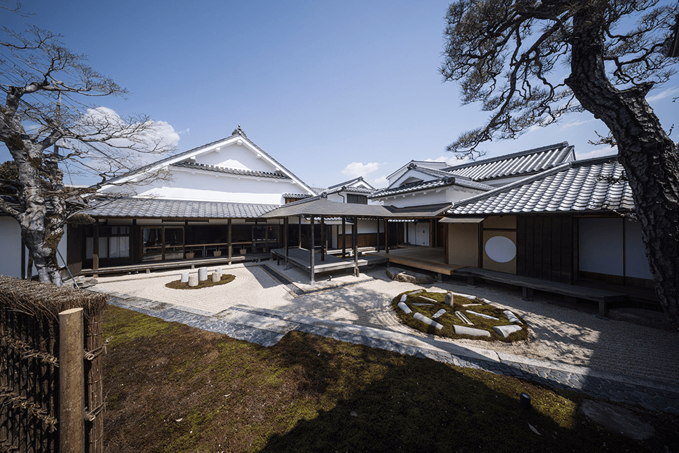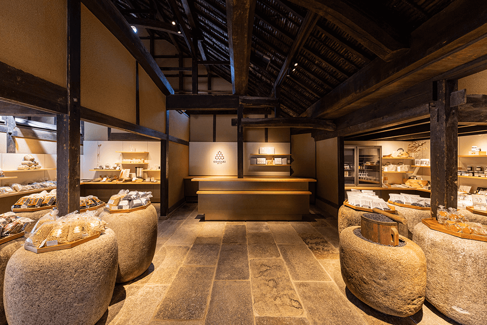 瀬戸内海周辺から取れる京都の町屋で使われていた町屋石で、建物に足を踏み入れる前の店先から始まり、小売用の土間、旧酒蔵を改造した豆料理のパフォーマンススペースへと、異なった目的で建てられた建物を一つに繋げる役割を果たしている。また二抱えはありそうな重量感ある棗型の石の手水鉢の存在も大きい。 数十個を小売スペースに使って圧倒的な時代感と存在感を作り出している。高く吹き抜けている小屋裏現しの天井に見える煤で黒ずんだ太い梁が、暗く闇に沈んでいる状態に保たれていることも、長い歳月を感じさせる一つであろう。来場者は一年間で2万人を超え、中庭に面したカフェを利用するため連日長蛇の列になったと聞く。 カフェ正面に広がる、中庭の斜めに切り取られた石庭、外廊下を橋がかりに見立てて新たに設けられた能舞台、大正期に建てられたレトロな建物が連なる景色は、現代生活者が時代とともに忘れてしまった豊かな昔風景に他ならない。