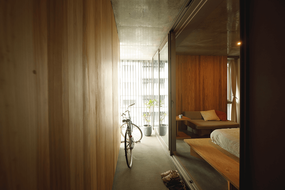 各階5室が4層の中廊下形式ではあるが、驚くほど通気性がよく清々しい空気が流れている。縦格子の住戸扉を開けて進むと、各戸のベランダスペースに通じ、街の風景が透かし見えるのが最大の特徴。この一連の「通り土間」と呼ぶスペースは、占有外部空間であり、自転車置き場にも、沓脱でもあり、リビングダイニングでもありテラスでもある。大きな間口のガラスサッシュは個室内部と外部との環境分離でしかなく、これを解放すると、個室が広がり街に溶け出し、様々な活動を促す。最小ワンルームでありキッチン、トイレ浴室などの諸機能は、オープンに設けられて家電機器類も簡潔にセッティングされ無駄がなく、ベッドやソファー、机など造作家具は合板のシンプルな作りで小気味良い。