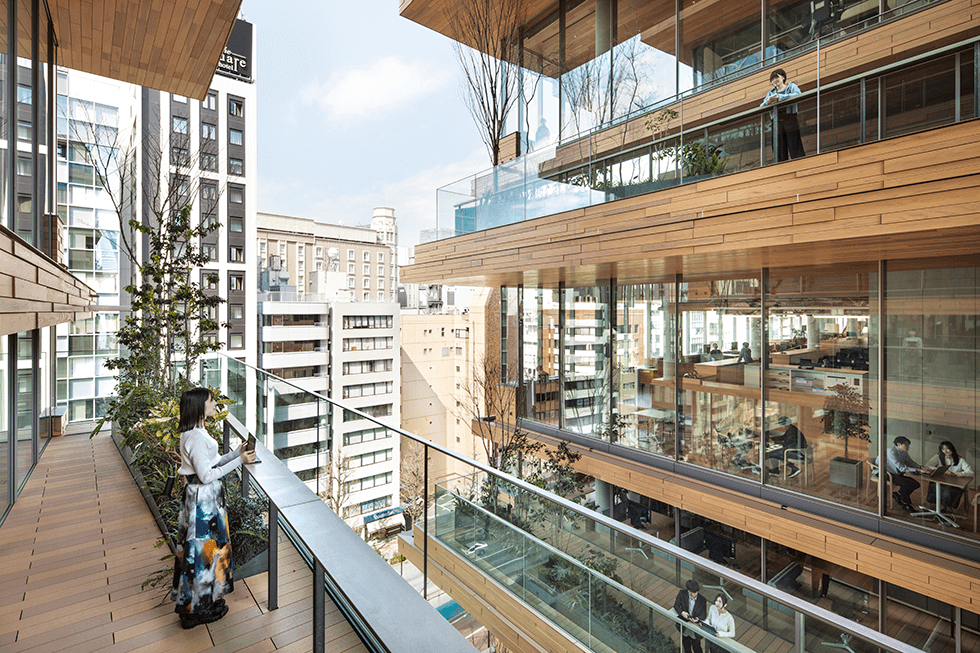 人やまちとつながりを感じる木質段床オフィス