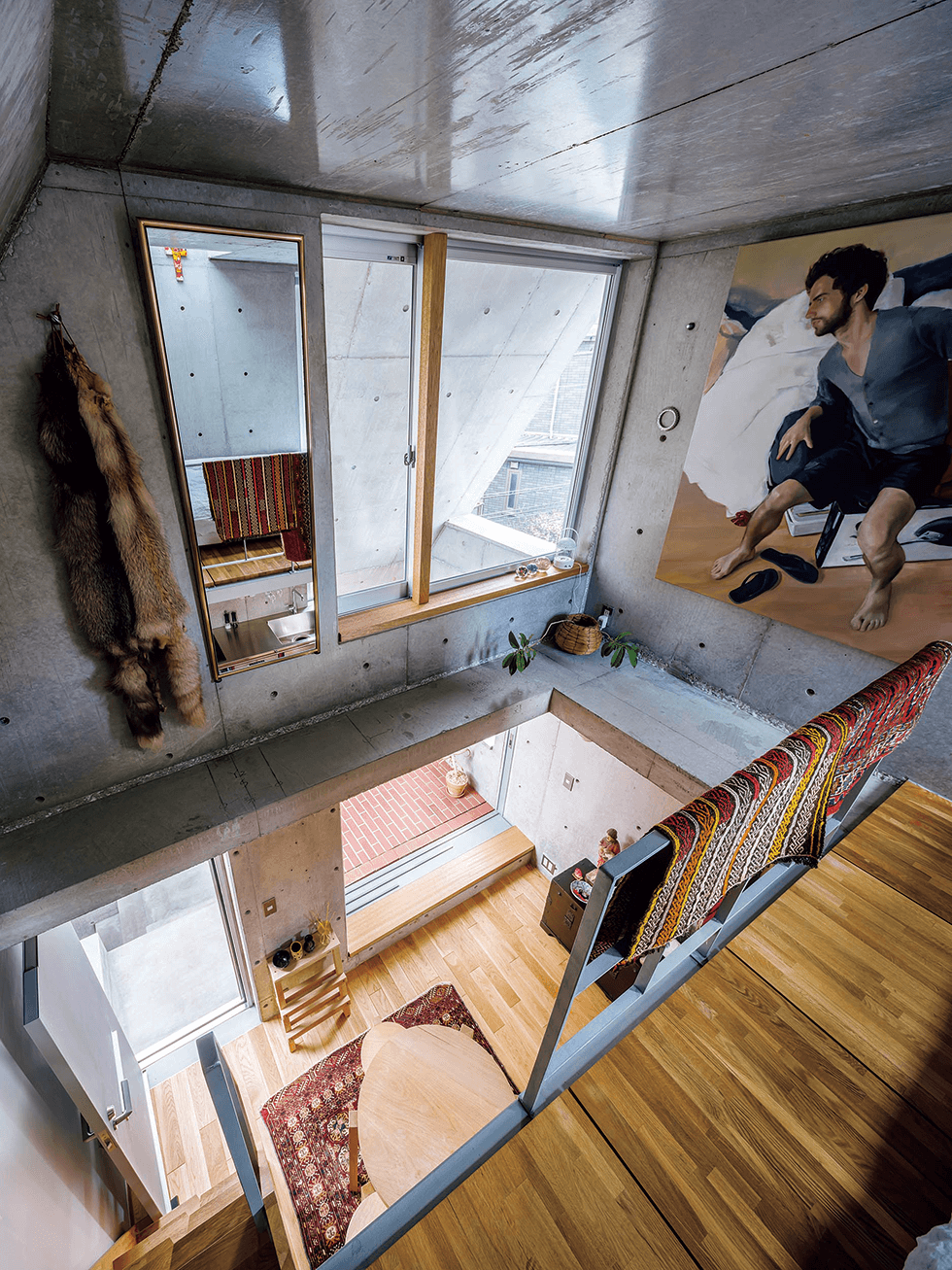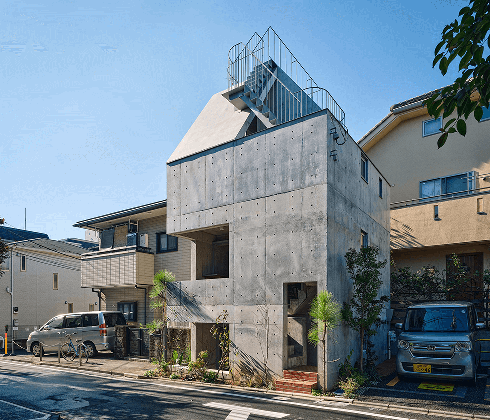 内と外の空間を重ねて小さな家を大きく住む。豊かな半屋外空間は、生活を拡張する奥行きをつくり、さまざまな変化を許容する。鉛直軸は大地と天空をつなぎ、個性的な住まいの顔を都市に示す。