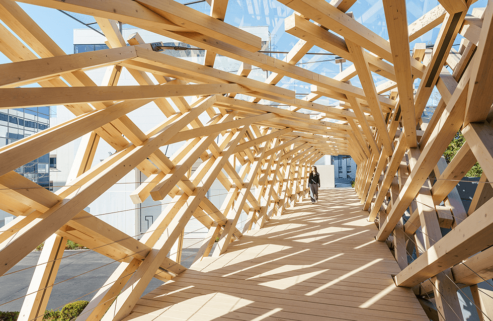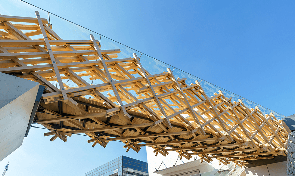 一般流通材のヒノキ集成材120角を螺旋状に組み上げ、約26mの木造人道橋を実現