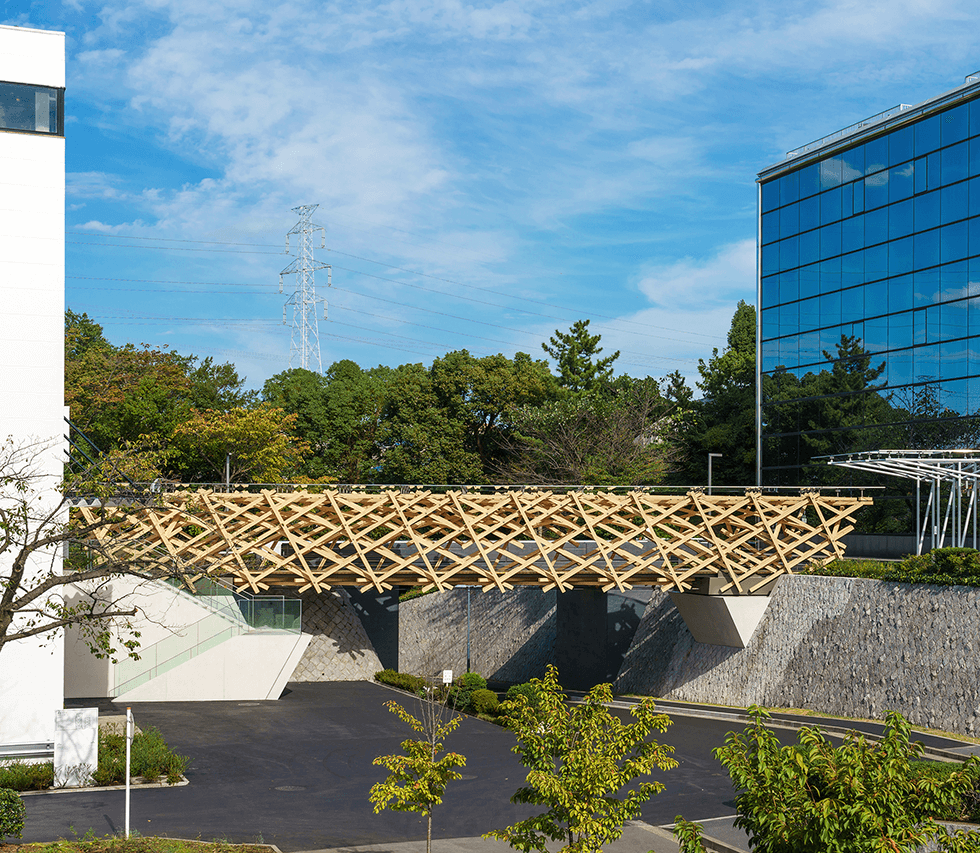 研究施設内にある、事務棟と実験棟をつなぐ周回通路の一部を担う木人道橋。120角の一般流通材を二重螺旋状に組み上げた木架構が約27mのロングスパン構造を形成し、柱脚には環境配慮コンクリートを採用している。