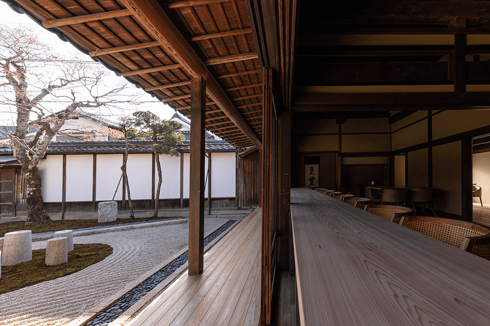 瀬戸内海周辺から取れる京都の町屋で使われていた町屋石で、建物に足を踏み入れる前の店先から始まり、小売用の土間、旧酒蔵を改造した豆料理のパフォーマンススペースへと、異なった目的で建てられた建物を一つに繋げる役割を果たしている。また二抱えはありそうな重量感ある棗型の石の手水鉢の存在も大きい。 数十個を小売スペースに使って圧倒的な時代感と存在感を作り出している。高く吹き抜けている小屋裏現しの天井に見える煤で黒ずんだ太い梁が、暗く闇に沈んでいる状態に保たれていることも、長い歳月を感じさせる一つであろう。来場者は一年間で2万人を超え、中庭に面したカフェを利用するため連日長蛇の列になったと聞く。 カフェ正面に広がる、中庭の斜めに切り取られた石庭、外廊下を橋がかりに見立てて新たに設けられた能舞台、大正期に建てられたレトロな建物が連なる景色は、現代生活者が時代とともに忘れてしまった豊かな昔風景に他ならない。