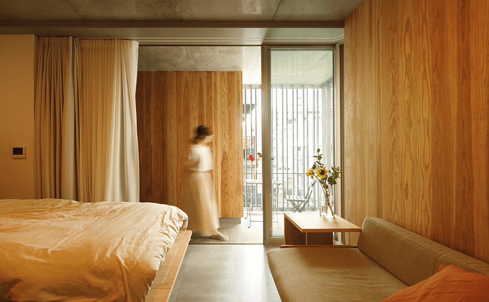 各階5室が4層の中廊下形式ではあるが、驚くほど通気性がよく清々しい空気が流れている。縦格子の住戸扉を開けて進むと、各戸のベランダスペースに通じ、街の風景が透かし見えるのが最大の特徴。この一連の「通り土間」と呼ぶスペースは、占有外部空間であり、自転車置き場にも、沓脱でもあり、リビングダイニングでもありテラスでもある。大きな間口のガラスサッシュは個室内部と外部との環境分離でしかなく、これを解放すると、個室が広がり街に溶け出し、様々な活動を促す。最小ワンルームでありキッチン、トイレ浴室などの諸機能は、オープンに設けられて家電機器類も簡潔にセッティングされ無駄がなく、ベッドやソファー、机など造作家具は合板のシンプルな作りで小気味良い。