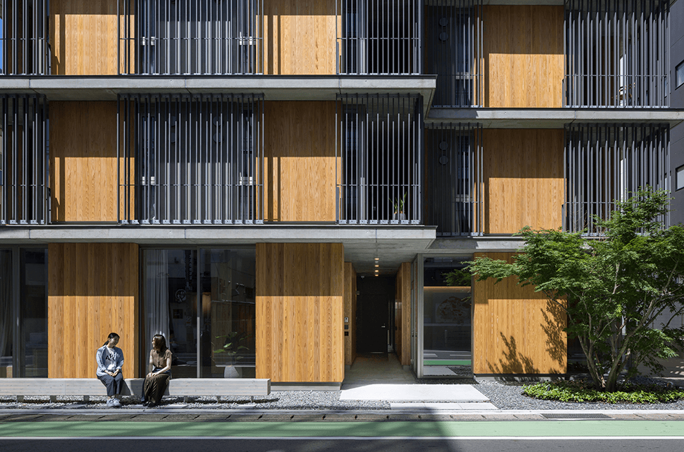 通り土間は前庭や縁側、リビングの延長として暮らしを豊かにするとともに、建物全体に通風を促し微気候に順応する住まい方を生む。構造はCLT 壁とRC床による都市木造耐火建築とした。ハイブリット架構とすることで、床の遮音性能確保、CLT壁の自由な配置やロングスパン化を実現している。通り土間を積層した木の住まいは、積極的に周辺環境を取り込み、都市に心地良く暮らす新しい集合住宅を提起する。