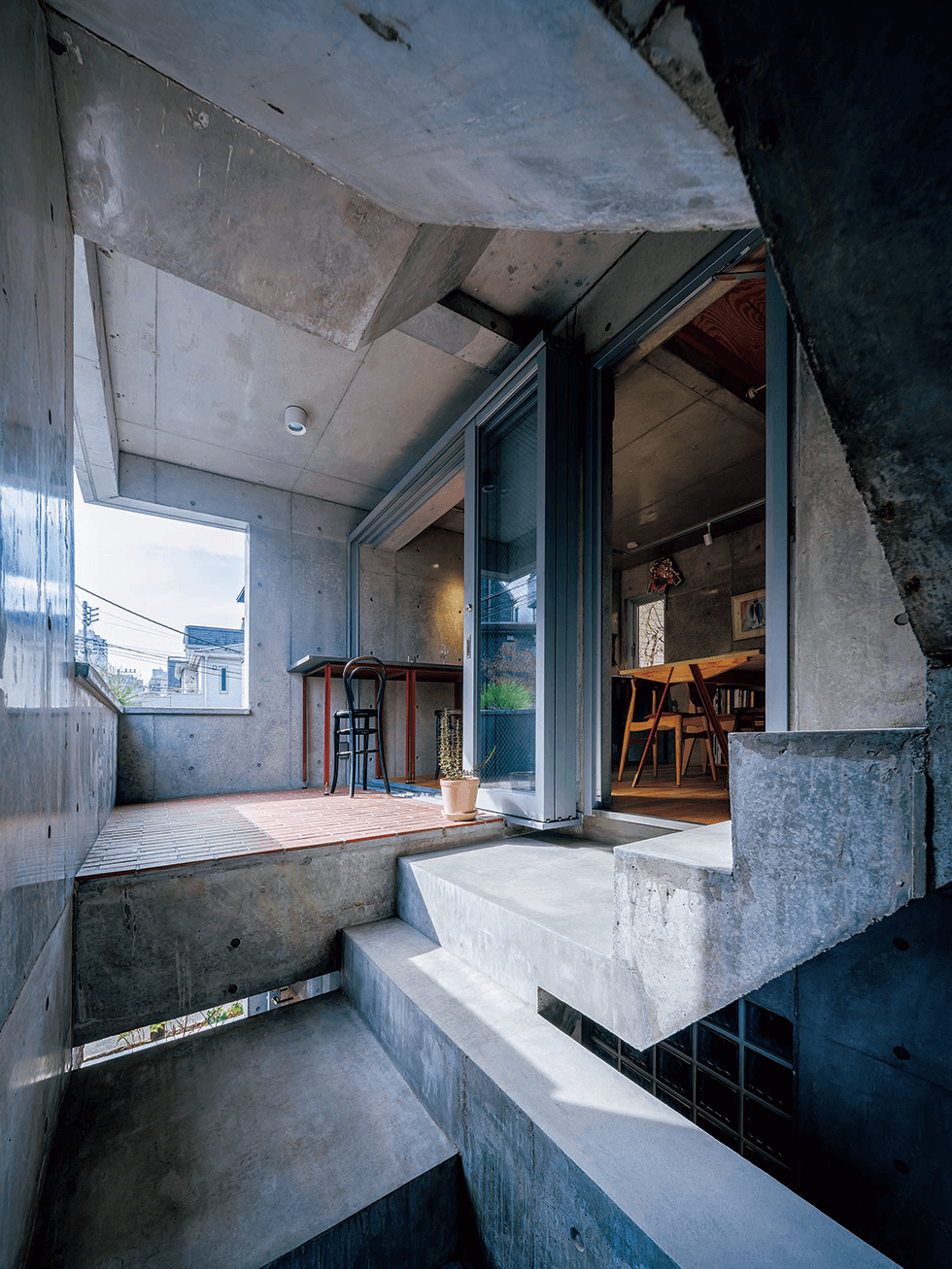 内と外の空間を重ねて小さな家を大きく住む。豊かな半屋外空間は、生活を拡張する奥行きをつくり、さまざまな変化を許容する。鉛直軸は大地と天空をつなぎ、個性的な住まいの顔を都市に示す。