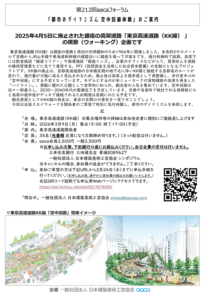 第212回 aacaフォーラムでは、「空中回廊体験」と題し、東京高速道路(KK線)を実際に歩きながら視察する特別企画を実施いたします。